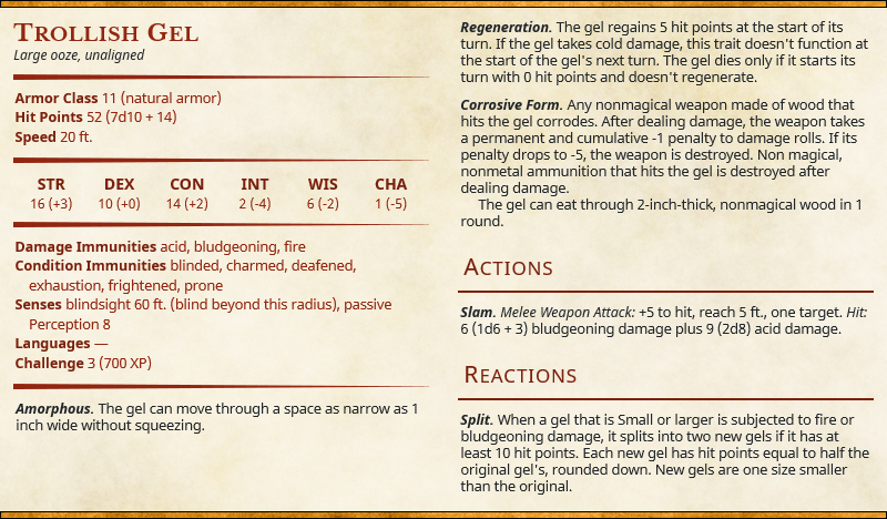 In this article, you’ll get the trollish gel’s stat block, as well as its usual habitats and combat tactics. However, these details aren’t true for all trollish gels, so use them however fits best for your adventure!